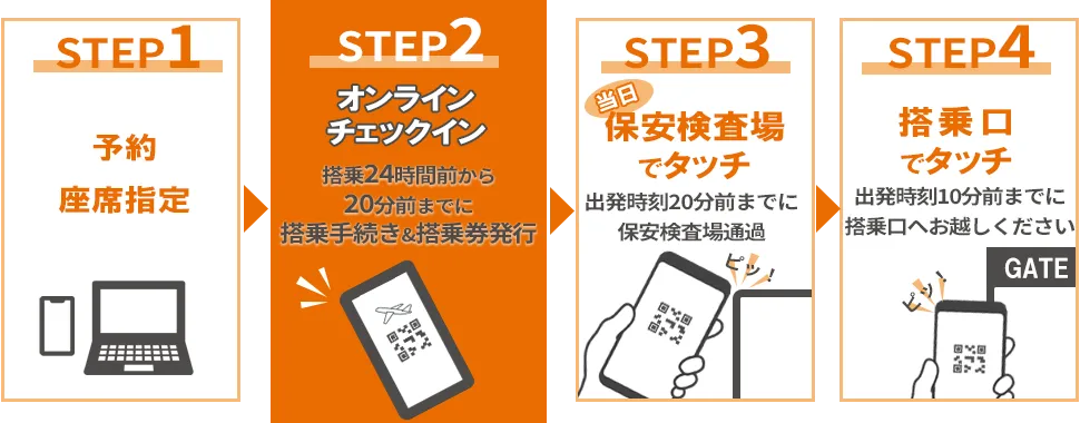 ・便出発の24時間前から搭乗20分前まで搭乗手続きと搭乗券発行ができるサービスです。